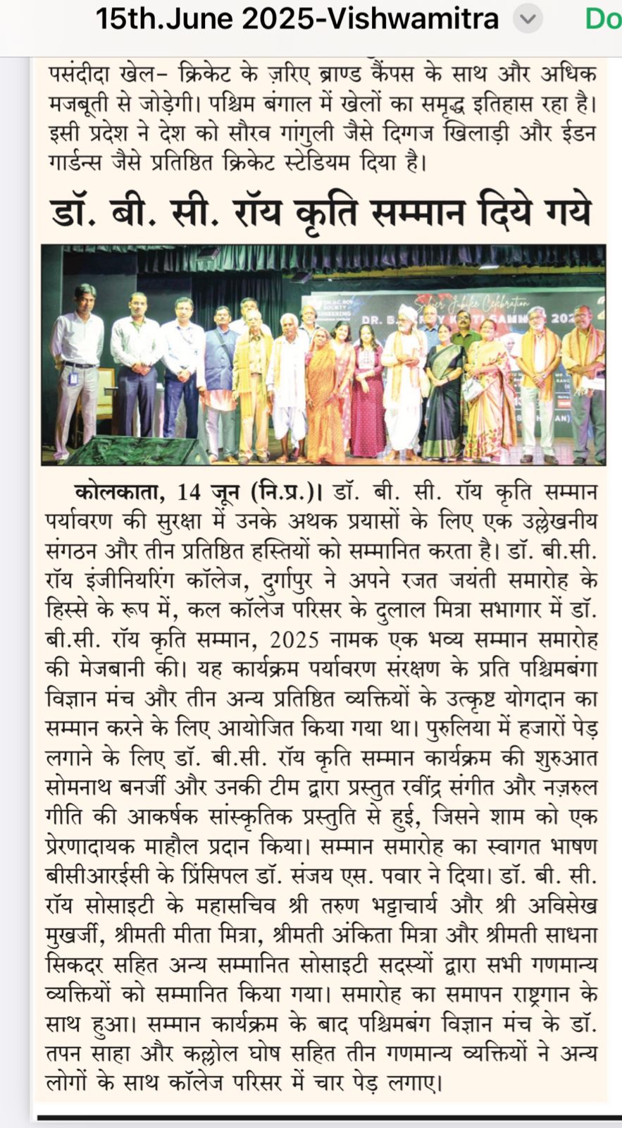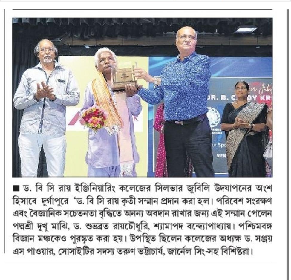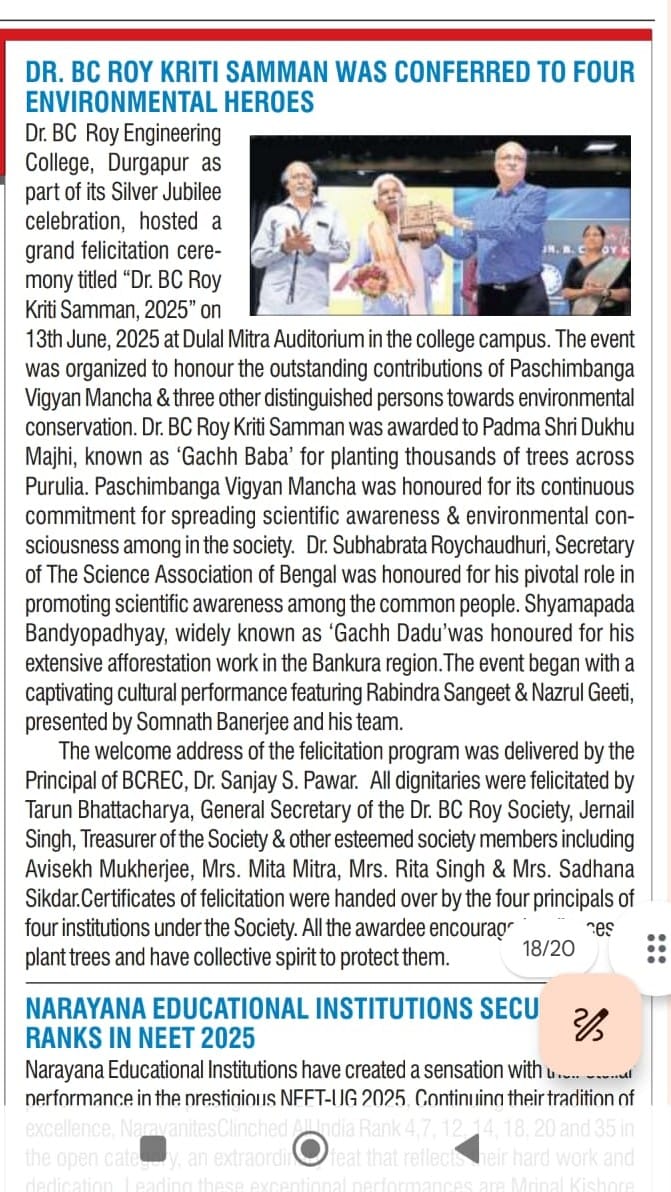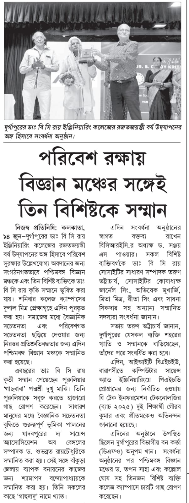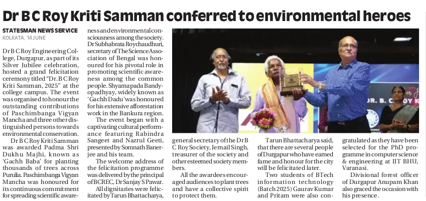 Dr. B. C. Roy Kriti Samman 2025 Honors Environmental HeroesOn June 13, 2025, Dr. B. C. Roy Engineering College, Durgapur, celebrated its Silver Jubilee with the “Dr. B. C. Roy Kriti Samman” at Dulal Mitra Auditorium. Four environmental champions were honored: Padma Shri Mr. Dukhu Majhi (‘Gachh Baba’) for planting thousands of trees in Purulia, Paschimbanga Vigyan Mancha for promoting scientific and environmental awareness, Dr. Subhabrata Roychaudhuri for advancing public science education, and Mr. Shyamapada Bandyopadhyay (‘Gachh Dadu’) for afforestation in Bankura.The event featured a cultural performance by Mr. Somnath Banerjee’s team, a welcome address by Principal Dr. Sanjay S. Pawar, and felicitations by Mr. Tarun Bhattacharya and other Society members. Awardees encouraged tree planting and conservation. Durgapur’s Divisional Forest Officer, Mr. Anupam Khan, attended. The ceremony ended with the National Anthem, followed by tree planting on campus. Two B.Tech students, Gaurav Kumar and Pritam, were also recognized for securing Ph.D. positions at IIT BHU.