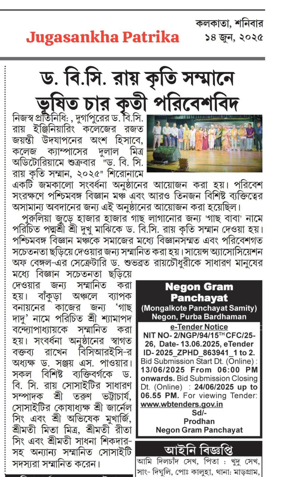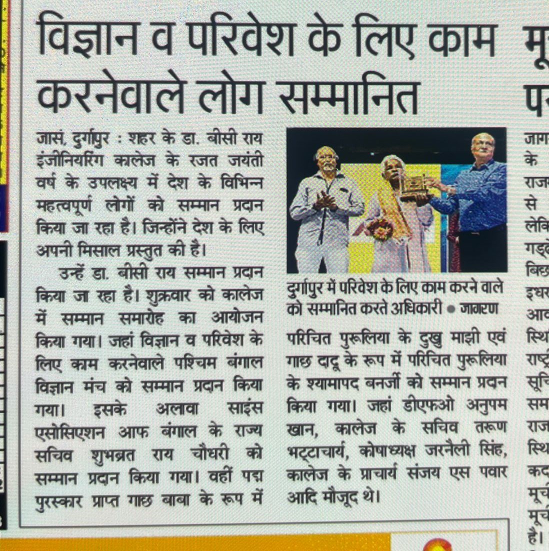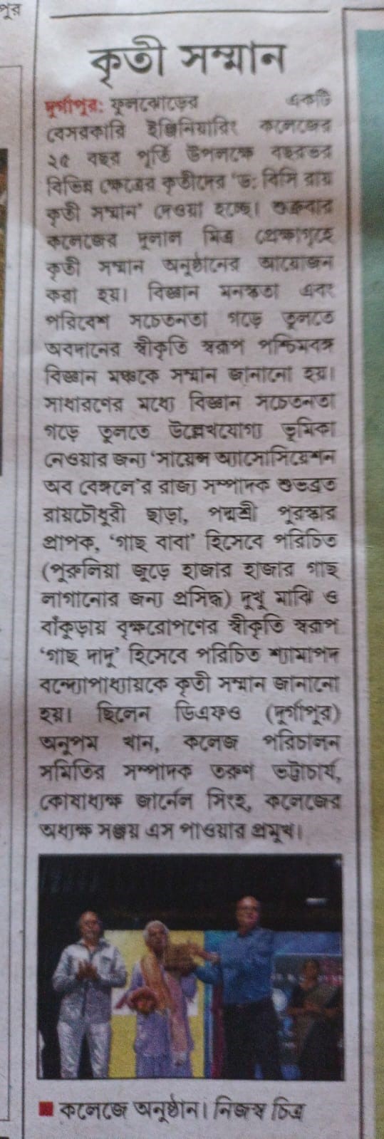 Dr. B. C. Roy Kriti Samman 2025 Honors Environmental HeroesOn June 13, 2025, Dr. B. C. Roy Engineering College, Durgapur, celebrated its Silver Jubilee with the “Dr. B. C. Roy Kriti Samman” at Dulal Mitra Auditorium. Four environmental champions were honored: Padma Shri Mr. Dukhu Majhi (‘Gachh Baba’) for planting thousands of trees in Purulia, Paschimbanga Vigyan Mancha for promoting scientific and environmental awareness, Dr. Subhabrata Roychaudhuri for advancing public science education, and Mr. Shyamapada Bandyopadhyay (‘Gachh Dadu’) for afforestation in Bankura.The event featured a cultural performance by Mr. Somnath Banerjee’s team, a welcome address by Principal Dr. Sanjay S. Pawar, and felicitations by Mr. Tarun Bhattacharya and other Society members. Awardees encouraged tree planting and conservation. Durgapur’s Divisional Forest Officer, Mr. Anupam Khan, attended. The ceremony ended with the National Anthem, followed by tree planting on campus. Two B.Tech students, Gaurav Kumar and Pritam, were also recognized for securing Ph.D. positions at IIT BHU.
