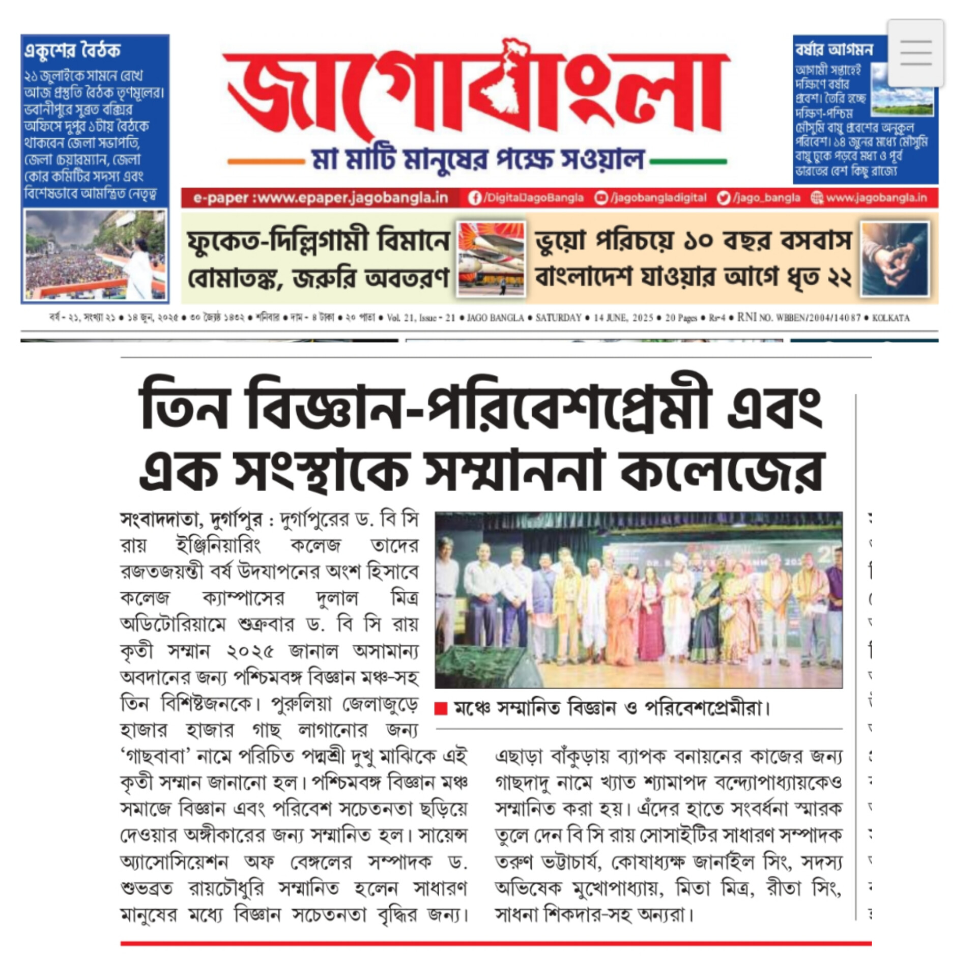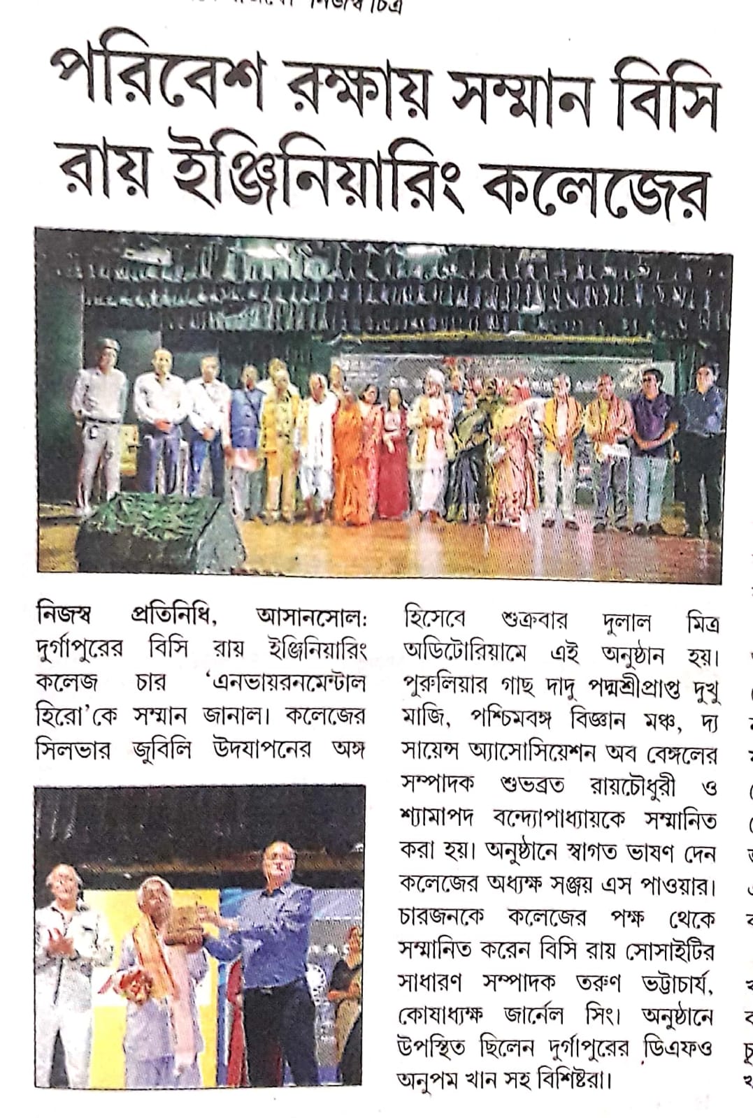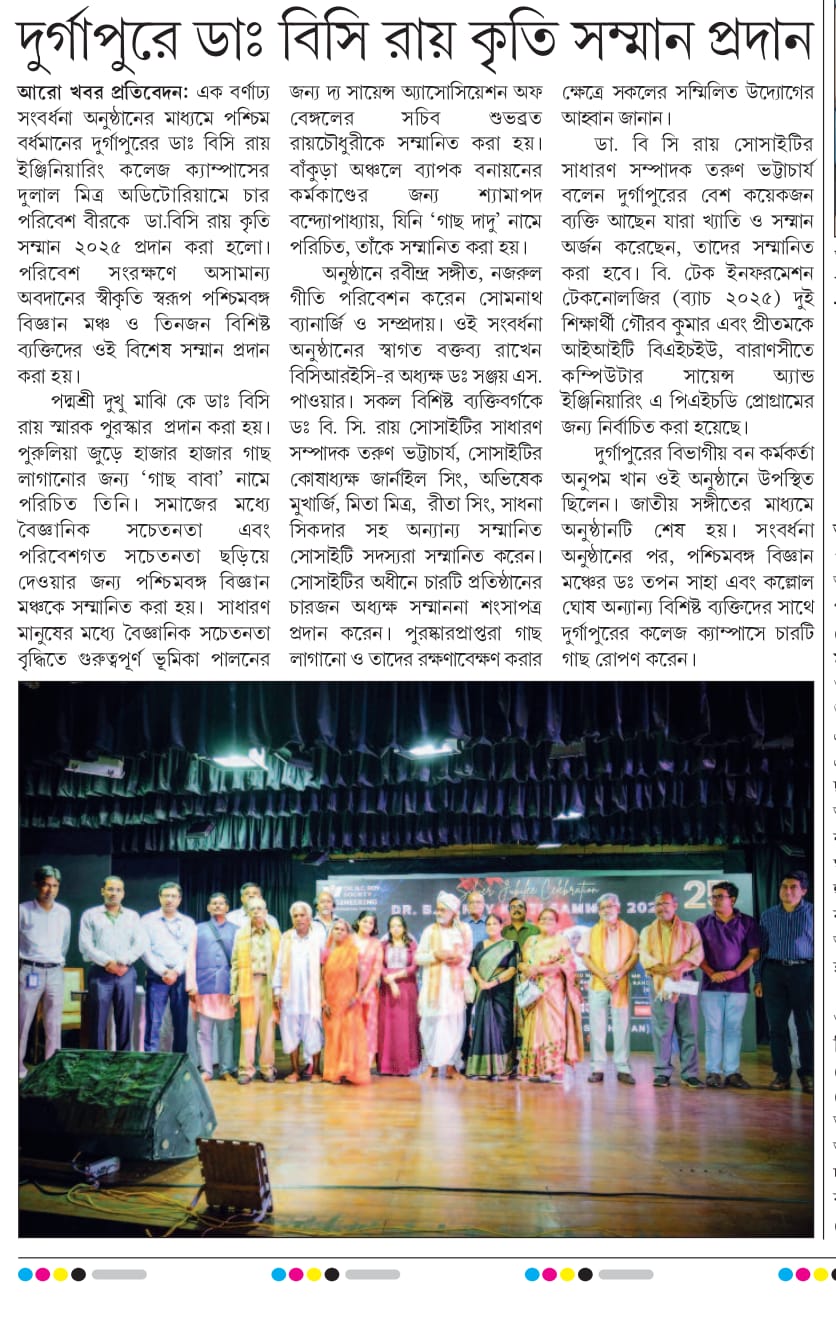 Dr. B. C. Roy Kriti Samman 2025 Honors Environmental HeroesOn June 13, 2025, Dr. B. C. Roy Engineering College, Durgapur, celebrated its Silver Jubilee with the “Dr. B. C. Roy Kriti Samman” at Dulal Mitra Auditorium. Four environmental champions were honored: Padma Shri Mr. Dukhu Majhi (‘Gachh Baba’) for planting thousands of trees in Purulia, Paschimbanga Vigyan Mancha for promoting scientific and environmental awareness, Dr. Subhabrata Roychaudhuri for advancing public science education, and Mr. Shyamapada Bandyopadhyay (‘Gachh Dadu’) for afforestation in Bankura.The event featured a cultural performance by Mr. Somnath Banerjee’s team, a welcome address by Principal Dr. Sanjay S. Pawar, and felicitations by Mr. Tarun Bhattacharya and other Society members. Awardees encouraged tree planting and conservation. Durgapur’s Divisional Forest Officer, Mr. Anupam Khan, attended. The ceremony ended with the National Anthem, followed by tree planting on campus. Two B.Tech students, Gaurav Kumar and Pritam, were also recognized for securing Ph.D. positions at IIT BHU.